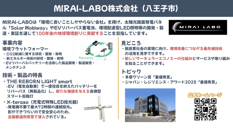 環境主義を企業理念に、EVリパーパス製品や太陽光路面発電、様々な省エネ環境製品の開発等を手掛け、100年後の地球環境をデザインする環境プラットフォーマーの製品を八王子の新拠点で紹介します。