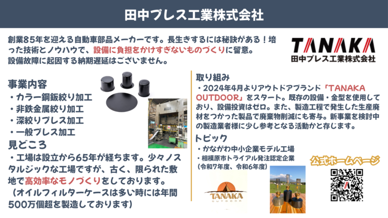| 会社名 | 田中プレス工業株式会社 http://www.tanaka-press.co.jp/ |