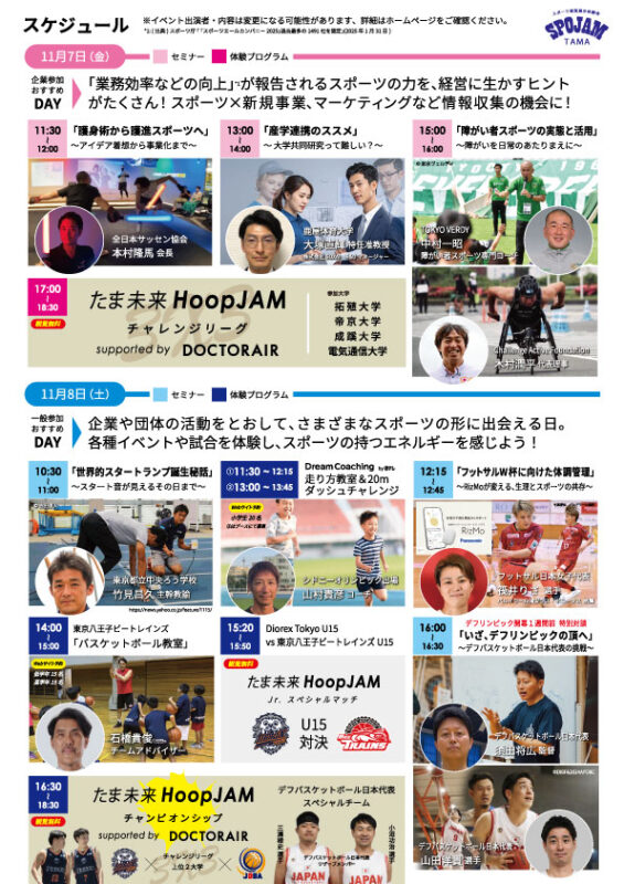 そのほか、小学生向けの走り方教室やデフリンピックで使用される光スターターを使った「20mダッシュチャレンジ」、東京八王子ビートレインズによるバスケットボール教室、大学・プロチーム・日本代表選手が参加する「たま未来 Hoop JAM supported by DOCTORAIR」など、世代を問わず楽しめる多彩なプログラムが展開されます。